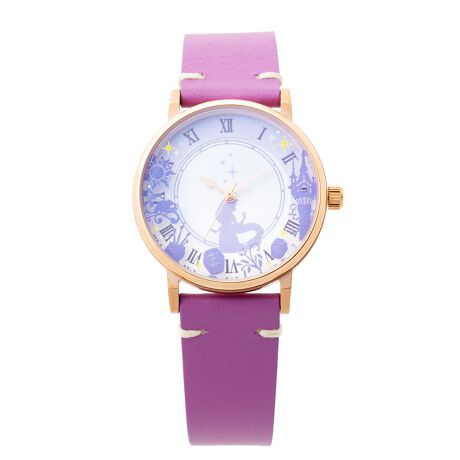 『ラプンツェル』のシルエットをダイヤルの中心にあしらい、ガラス風防には物語に登場する太陽やカメレオンのパスカル、ランタンや塔がにぎやかに散りばめられたデザイン。鮮やかなパープルのベルトをセットに。