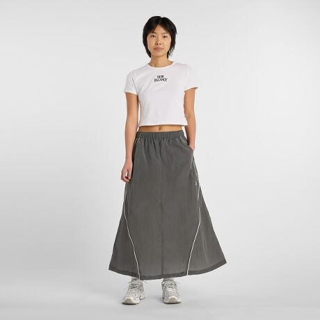 虹色のリップストップがレトロな輝きを放つレガシーミディスカート。サイドの白いパイピングラインがクラシカルなデザインを引き立て、リバースポケットと裾バンジーコードで機能性も抜群。左ポケット下の熱転写フライングNBロゴがアクセント。スポーツシーンからデイリーまで活躍する一枚。