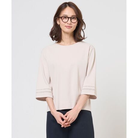 ■デザイン軽やかなフレア袖が女性らしさを引き立てる、7分袖のカットソー。二の腕を優しくカバーしながら、上品な抜け感のあるデザインに仕上げました。袖口には、繊細な幾何柄レースをあしらい、さりげない華やぎをプラスしました。1枚で着映えし、ジャケットやカーディガンのインナーとしても活躍してくれます。デイリーにはもちろん、オフィスカジュアルにもスタイリングを楽しめるアイテムです。カラーは、清潔感あふれる上品なホワイト(#001)、肌なじみが良く落ち着いた印象のベージュ(#033)、爽やかで洗練されたライトアクア(#072)の3色の展開です。