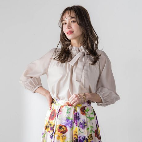 袖とリボンは程よい透け感と光沢・表情感のあるブラウス生地を使用。