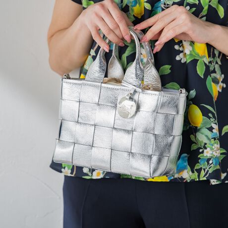 [型番:2602-62110]【デザインの特徴】トレンド感あふれるメタリック素材が目を惹く、編み込みデザインのミニバッグ。シンプルなコーディネートにさりげない華やぎをプラスします。コンパクトなサイズ感ながら、必要なアイテムがしっかり収まる実用性も魅力。軽やかで存在感のあるシルバーは、きれいめにもカジュアルにもマッチ。コーディネートのアクセントとして活躍する、旬顔バッグです。