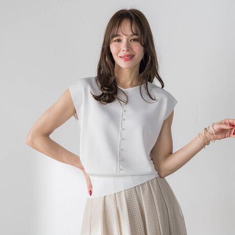 光沢感が美しい素材で編み上げたフレンチスリーブニット。シンプルなVネックとクルーネックにパール装飾、前後2wayでお楽しみいただけます。