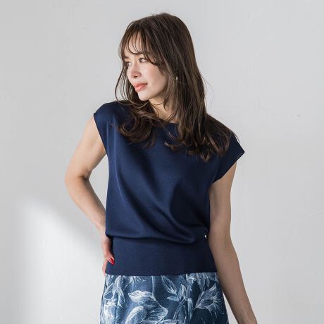光沢感が美しい素材で編み上げたフレンチスリーブニット。シンプルなVネックとクルーネックにパール装飾、前後2wayでお楽しみいただけます。