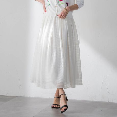 細かいチェック柄のラッセルレースを使用したタックフレアースカートです。