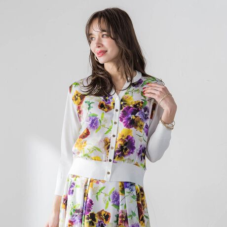 彩り豊かなパンジーを使用した作品を前身頃に使用したキーネックニットカーディガン。