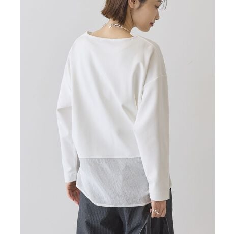 ※オフホワイトのみ3月下旬入荷予定です。<br/><br/>異素材使いで差がつく上品Vネックトップス顔まわりをすっきり見せてくれるVネックデザインが魅力の一枚です。ほどよい開き具合で上品さを保ちつつ、抜け感のある大人カジュアルな印象に仕上げてくれます。身頃にはなめらかでハリのあるポンチ素材を使用し、きれいなシルエットをキープします。裾には異素材を切り替え、さりげないアクセントをプラスしています。ゆったりとしたシルエットで体のラインを拾いにくく、リラックス感のある着心地です。パンツにもスカートにも合わせやすく、通勤からお出かけまで幅広いシーンで活躍します。シンプルながらもデザイン性のあるカットソーとして、着回し力の高いアイテムです。透け感[なし]