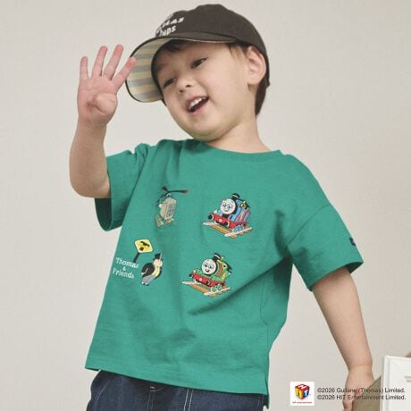 「きかんしゃトーマス」の刺しゅうと、プリントを組み合わせた遊び心あふれる半袖Tシャツ。