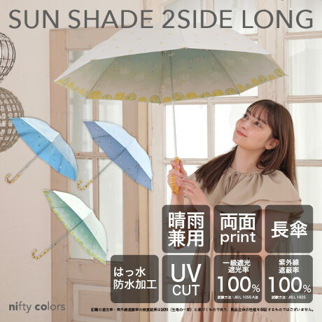 傘生地の外側と内側それぞれ異なるデザインをプリントした映え効果抜群の親骨50cmの晴雨兼用日傘の長傘です。紫外線遮蔽率100%、UPF50+、遮光率100%、遮熱性効果のある一級遮光生地で強い日差しや暑さをしっかり遮ります。さらに、肌の深部に影響を与える近赤外線も100%遮断します。耐水圧17,000mm以上のはっ水・防水機能付きで、雨の日も安心。安全ろくろ仕様で開閉もスムーズです。※記載の紫外線遮蔽率(UVカット率)・UPF値・近赤外線遮蔽率・遮光率・耐水圧の値は、生地単体での測定値です。傘本体の性能を保証する数値ではなく、縫製部分などのUV加工が施されていない箇所も同様です。