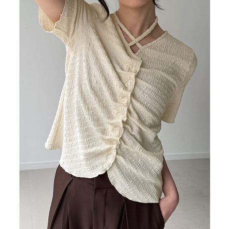フロントシャーリング首元クロスリボン半袖カーディガン