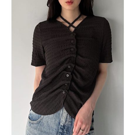 フロントシャーリング首元クロスリボン半袖カーディガン
