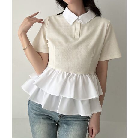 Meiru ドッキングペプラム半袖ポロ