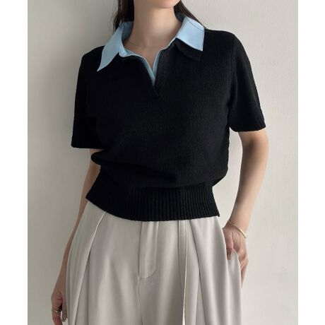 Meiru 襟付き半袖ミックスニットトップス