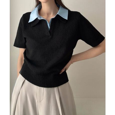 Meiru 襟付き半袖ミックスニットトップス