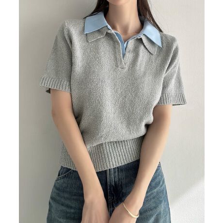 Meiru 襟付き半袖ミックスニットトップス