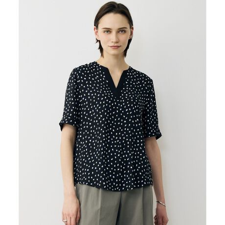 ■デザインデコルテをすっきりと見せるVラインデザインがポイントの5分袖ブラウスです。1枚でもINでも着映える様、存在感のある太めのラインで華やかさをプラスしました。二の腕をカバーしてくれるゆとりのある袖や、背面のコンシールファスナーで着脱しやすいのも嬉しいポイントです。カラー展開はセレモニーにも使いやすいオフホワイト×ブラックライン(002)、クールな印象のブラック×トープライン(005)、モードな柄が目を惹くモチーフドット柄×ブラックライン(805)の3色展開です。