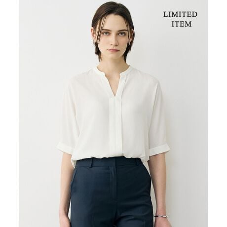 女性らしく、知的な印象のキーネックブラウス