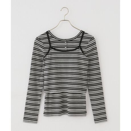 マルチボーダーのヘンリーネックトップスに、華奢なストラップのキャミソールを重ねたレイヤードデザイン。