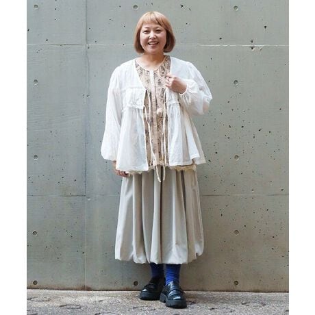 ふんわりとしたバルーンシルエットながら、切り替え下にタックを入れることで広がりすぎず、腰まわりはすっきりとした印象に仕上げました。