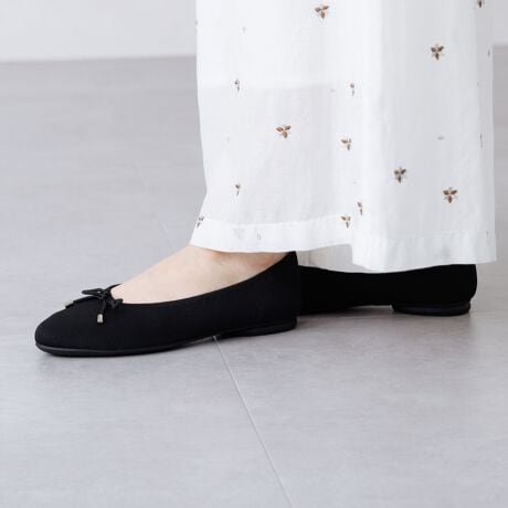 ニット素材を使用した洗えるパンプスがHIMIKOからデビュー!メタルパーツが付いたリボンがポイントのラウンドトゥフラットバレエパンプス。