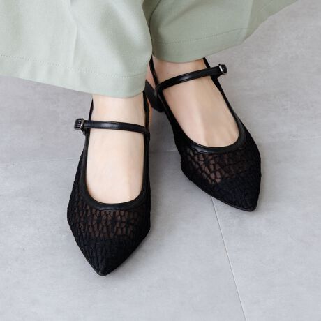 幾何学柄の立体感あるチュールで遊び心を添えた、抜け感のあるバックストラップシューズ。