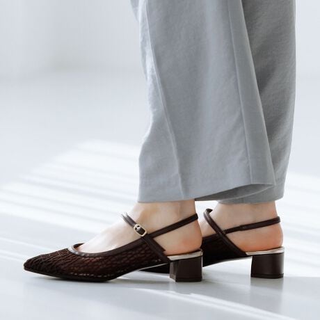 幾何学柄の立体感あるチュールで遊び心を添えた、抜け感のあるバックストラップシューズ。