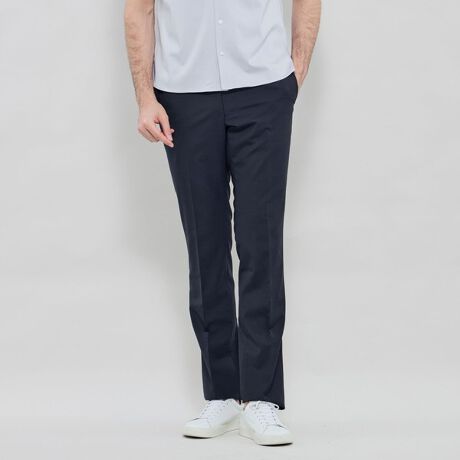 ウエスト部内側にゴムによるアジャスト機能を持たせたモデルです。定番トラウザースのすっきりとしたシルエットはそのままに、表からは見えないウエストゴムの伸縮による快適な穿き心地を実現しています。
