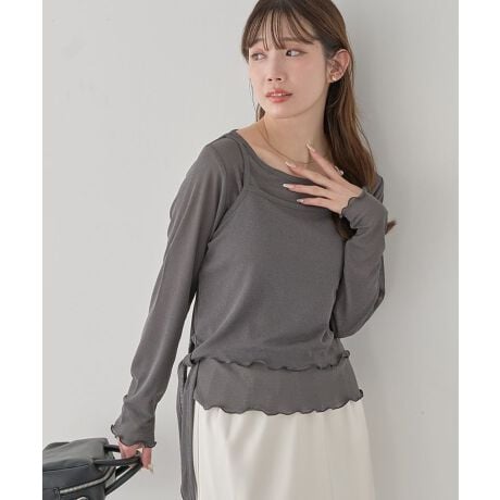 重ねるだけで大人可愛い、こなれレイヤードトップスシアーな長袖カットソーとキャミソールを重ねた、トレンド感のあるレイヤードトップスです。透け感のある柔らかな素材が軽やかな印象を演出し、シンプルながらも女性らしい雰囲気を引き立ててくれます。キャミソールはツイストデザインがアクセントになっており、重ねるだけでコーディネートに立体感をプラスします。さらにサイドリボンのディテールがさりげないポイントとなり、フェミニンな印象を与えてくれます。セットアイテムなので、忙しい朝でも簡単にバランスのよいスタイリングが完成するのも魅力です。デニムやスカートなどさまざまなボトムスと合わせやすく、カジュアルコーデを大人可愛く仕上げてくれます。普段のスタイリングに程よいトレンド感を取り入れられる、着回し力の高い一着です。透け感[あり]
