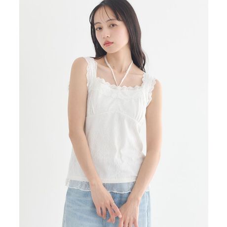 繊細レースで魅せる、大人可愛いホルターデザイン繊細な総レース素材が印象的なキャミソールです。やわらかなレースが上品な雰囲気を演出し、シンプルなコーディネートにもさりげない華やかさをプラスしてくれます。ホルターネックデザインがデコルテラインをきれいに見せ、女性らしいシルエットを引き立ててくれるのが魅力です。背中のマルチリボンは結び方をアレンジできるため、スタイリングに合わせて印象を変えられるのもうれしいポイントです。インナーとしてトップスやシアーアイテムと重ねれば、レースがアクセントになりコーディネートに奥行きをプラスします。タンクトップ感覚で着用できるため着回しやすく、デニムやスカートなどさまざまなアイテムと相性良く合わせられます。普段のカジュアルスタイルにやさしい女性らしさを添えてくれる、着回し力の高いアイテムです。透け感[ややあり]