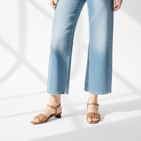 マキシ丈やシアー素材のワンピースに合わせれば、夏らしい軽やかな足元が完成。変形ヒールが程よいアクセントになり、後ろ姿まで抜かりなく。