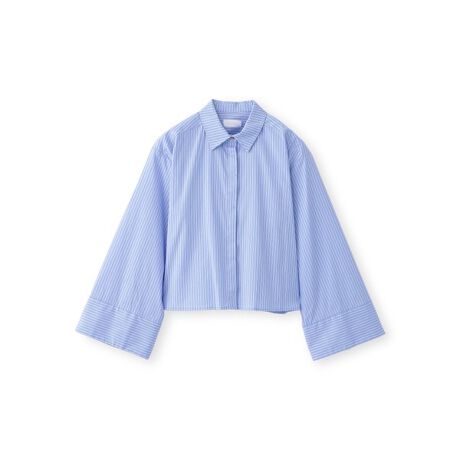 トレンド感のあるワイドスリーブのショート丈シャツ。幅広の袖と大きめのカフスがデザインポイントになっています。シンプルなシャツデザインながらも、シルエットでこなれた大人の抜け感スタイルが完成します。