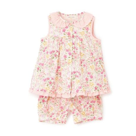 鮮やかな花柄に、ギンガムチェックのフリルとパイピングを添えたセットアップです。トップスは前開きのノースリーブで、合わせるインナー次第でロングシーズン着回せます。裾にタックをほどこしたパンツは、ふんわり広がる愛らしいシルエット。ウエストは総ゴム仕様のため、お着替えもスムーズです。セットアップはもちろん、お手持ちのアイテムと合わせたコーデも楽しめます。内側にお名前を記入できるタグつき。【おすすめの着用時期は春夏シーズン】