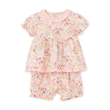 色鮮やかなフラワープリントが目を引くセットアップです。トップスのウエスト切り替えにギャザーを寄せ、ふんわり広がるシルエットに仕上げました。パフスリーブの袖や衿まわりのフリルが、女の子らしく華やかな雰囲気を演出。パンツは裾をゴムで絞った、丸みのある可愛らしいフォルムです。【おすすめの着用時期は春夏シーズン】