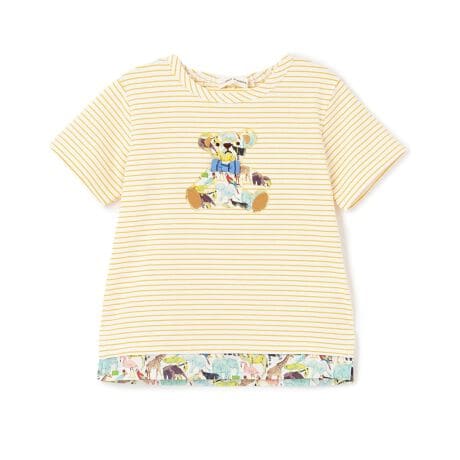 細めのボーダーに、愛らしいテディベアのアップリケをあしらった半袖Tシャツです。