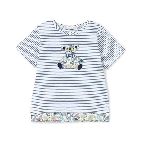 細めのボーダーに、愛らしいテディベアのアップリケをあしらった半袖Tシャツです。