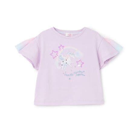 ユニコーンとレインボーの繊細なプリントに、キラキラ輝くパーツをトッピング♪ ゆったりとしたシルエットながら短い丈感のトレンドデザインです。