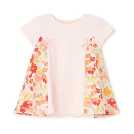 両サイドを小花柄で切り替えた、表情豊かなチュニックです。異素材のコントラストが目を引く、一枚でサマになるデザイン。たっぷりとしたフレアが歩くたびにふんわりと広がる、華やかなシルエットに仕上げました。後ろの衿ぐりはゴム仕様のため、お着替えもスムーズです。