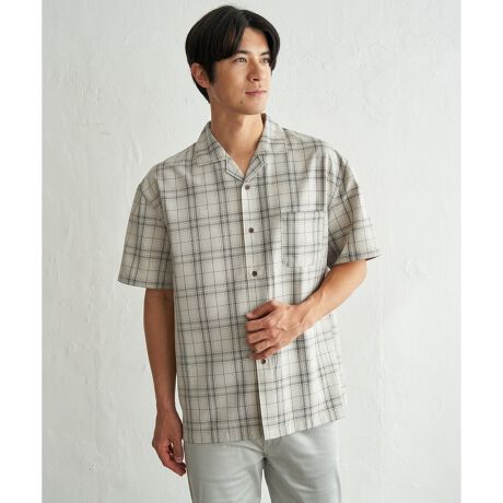 リネンのような風合いながらシワになりにくい、Reflax(R)(リフラクス)と呼ばれる素材を使用したオープンカラーシャツ。