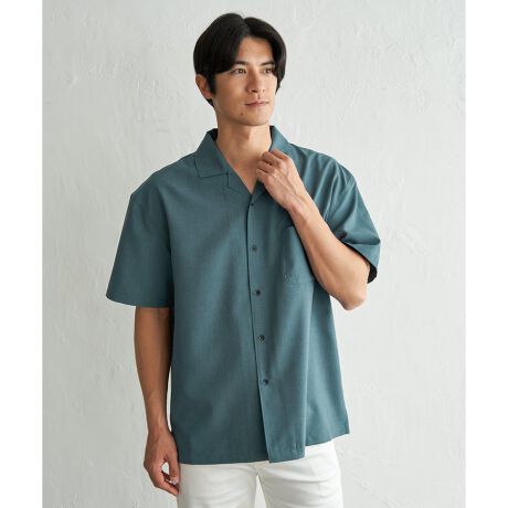リネンのような風合いながらシワになりにくい、Reflax(R)(リフラクス)と呼ばれる素材を使用したオープンカラーシャツ。