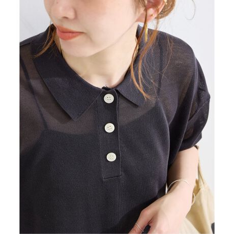 ハリ感あるポリエステル混素材のポロ型シルエットで釦を開けてスキッパー風にも着られる、程よいシアー感ある素材のニットになります。コンパクトでありながら、ゆったりとした身幅と後着丈が若干長めの仕様で、着用すると抜け感あるデザインになっています。