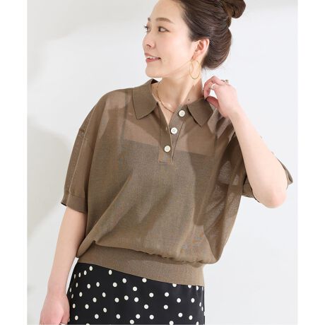 ハリ感あるポリエステル混素材のポロ型シルエットで釦を開けてスキッパー風にも着られる、程よいシアー感ある素材のニットになります。コンパクトでありながら、ゆったりとした身幅と後着丈が若干長めの仕様で、着用すると抜け感あるデザインになっています。