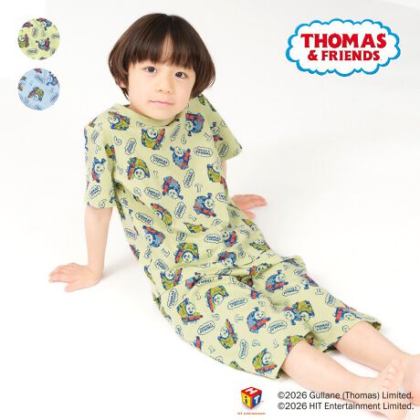 crescentから人気の「きかんしゃトーマス」デザインアイテムが登場。トーマス、パーシーの総柄が可愛い!Tシャツ素材の半袖Tシャツとハーフパンツのセットのパジャマ。綿100%でギフトやプレゼントにもオススメ!(ベビーサイズのみTシャツの脇のボタンとパンツの脇のボタンホールにボタンをとめて着れば、お腹が出にくい仕様になっています。)【アイテム】トップス ボトムス カジュアル お洒落 オシャレ かっこいい かわいい 可愛い 普段着 デイリーウェア トップス ボトムス 寝巻 ルームウェア 子ども こども 男児 男の子 ボーイズ キッズ ベビーサイズ トドラーサイズ 幼稚園 保育園 小学校 小学生 2026年春夏物新作 丸高衣料 贈り物 ギフト プレゼント 帰省 お泊り会 旅行 キャラクター グリーン 緑色 ブルー 青色 クレセント コットン100% 綿100%