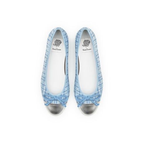 つま先には涼しげな印象のシープマイラーを使用し、ボディには淡いカラーのツイード素材を組み合わせたバレエシューズ。