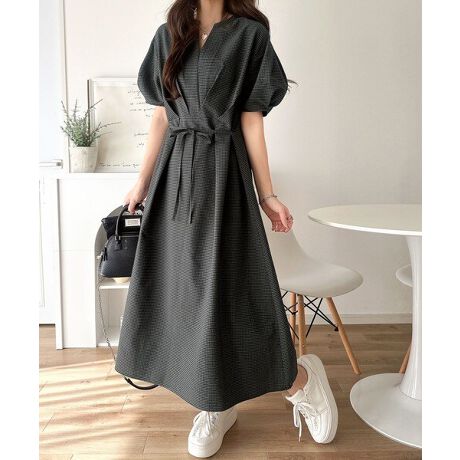 【UVカット・防シワ・吸水速乾機能】サッカーランタンスリーブステッチタックワンピ(無地・チェック柄)
