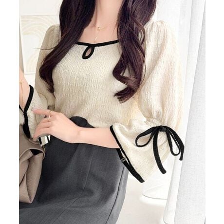 スクエアネックと配色パイピングで、お顔周りもスッキリ見せ◎