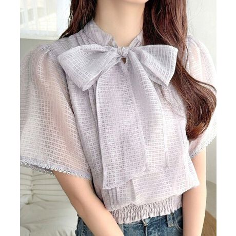 オーガンジーシアーチェック素材を使用した、軽やかで涼しげな印象のボウタイブラウス。