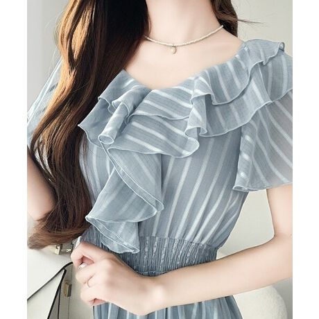 ひらりと華やかな主役級ワンピース♪たっぷりフリル×アシメの甘さに、きらりと光るシャイニーなシアーストライプが動くたび、上品なフェミニンさをプラスウエストシャーリングで楽ちんなのに美しく決まり、春夏にぴったりな軽やかな一着です!