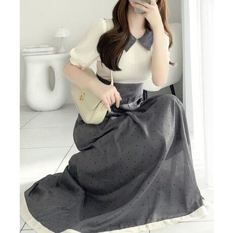 ボディー上部は肌触りの良いマルチリブ、襟とスカートはシアーなドットプリント生地