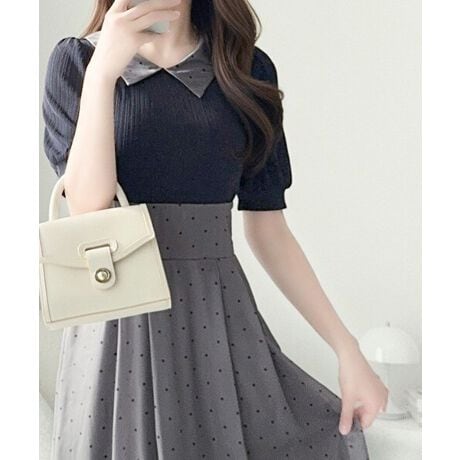 ボディー上部は肌触りの良いマルチリブ、襟とスカートはシアーなドットプリント生地