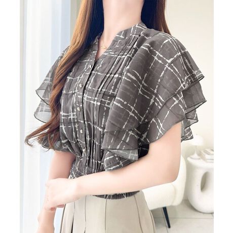 ボディーは透け感のあるシアーなシフォン素材に3色チェックをプリント。