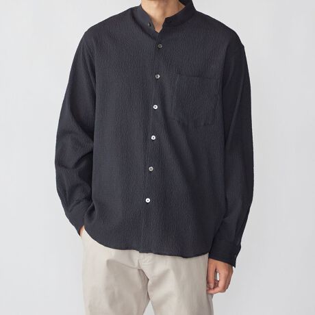 肌離れの良いサッカー生地を使用した大人顔のバンドカラーシャツ